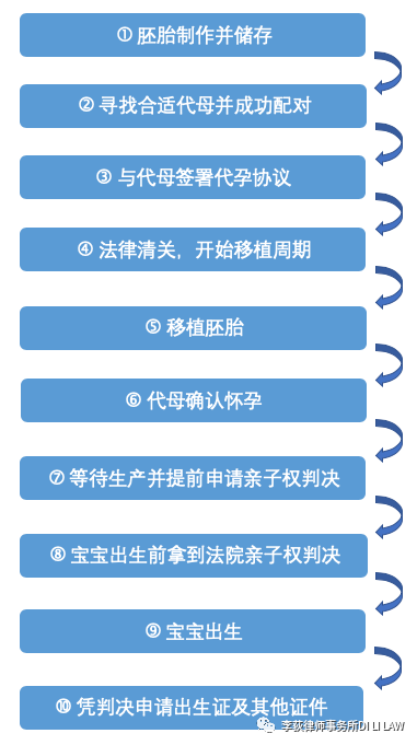总体来说,我们律师要做的事情就是从第3阶段签署代孕协议开始一直到在宝宝出生前顺利拿到法院下达的亲子权判决。